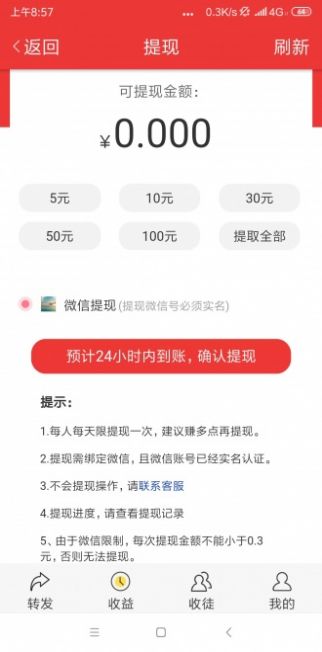2、收益满0.7元提现,随赚随提,支持提现到微信钱包上,提现24小时内到账
