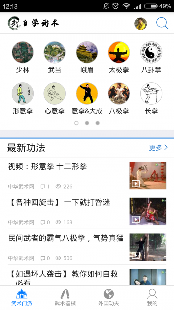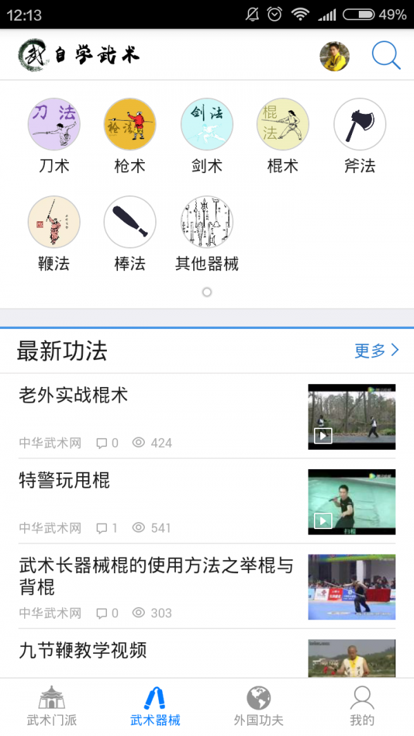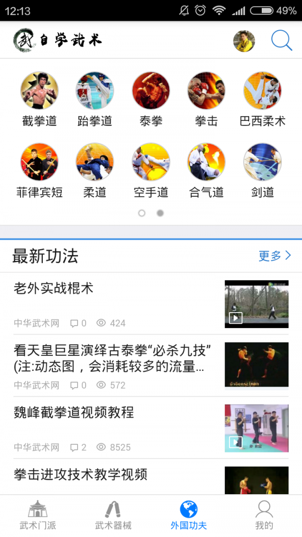 自学武术app收录了大量武术基本功教学视频,适合对武术感兴趣的参考使用,该应用还详细介绍了各大武术门派、常用武术器械以及各类功法秘籍等内容,自学武术收集天下武学,为武友们提供更加简单、便捷的练武方式。