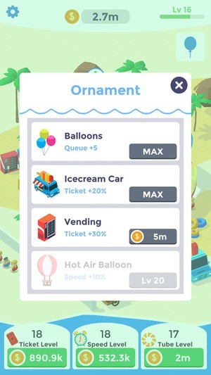 2、玩家在放置避暑公园游戏中,不仅要升级自己的等级,还要将游乐园的娱乐设施的等级提升上来。
