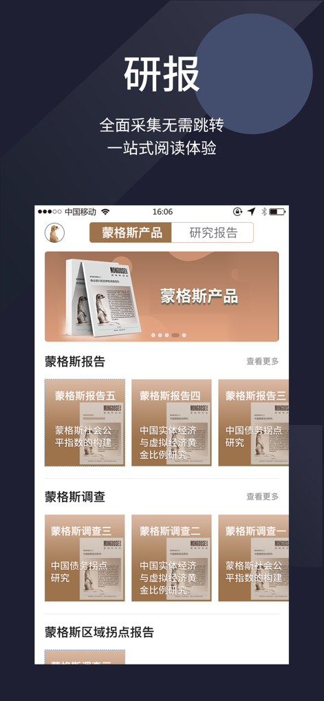 3、更多功能蒙格斯CPI月报、上市公司风险预警系统、合理房价评估系统、烽火台、中国房价地图、蒙格斯行研报告、中国宏观拐点预警等。