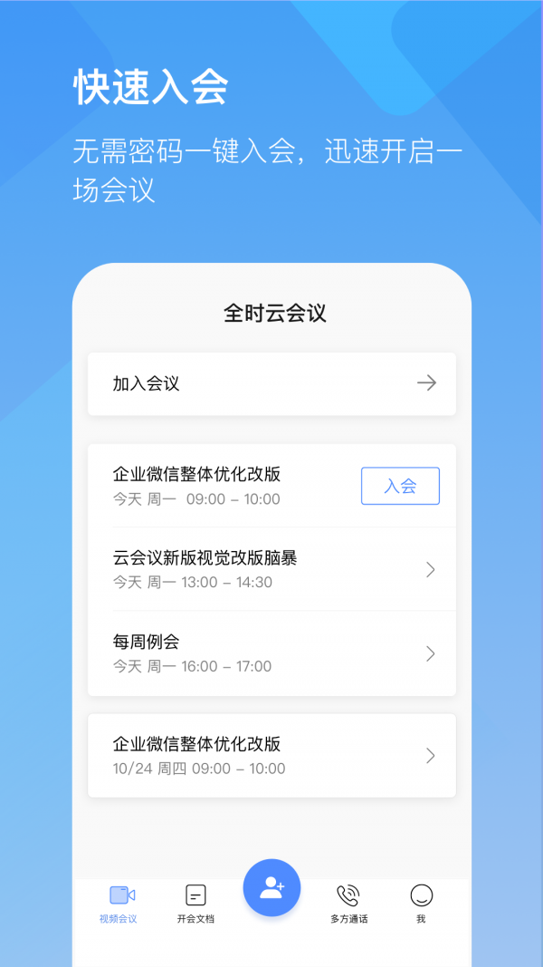 全时云会议app是专为企业视频会议打造的应用,能随时移动开会,支持密码管理会议,支持多方群聊和通话,支持多平台使用,更桌面共享文件,是企业视频会议的好帮手。