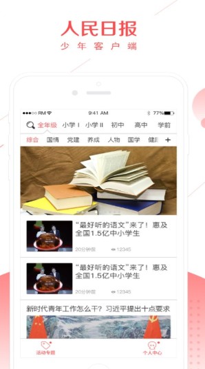 人民日报少年客户端是面向全国中小学德育素质教育的辅助平台,是人民日报社旗下的产品,现开设全年级、小学Ⅰ、小学Ⅱ、初中、高中五个层级。其中全年级下开设:综合、党建、阅读、我拍、我画、我写、研学七个栏目,其他层级下分别开设国情、养成、人物、国学、健康、自然、安全七个栏目。青少年是祖国的花朵未来。对青少年爱国精神培养是非常重要的事情,特意推出,这款阅读APP,面向全国的青少年用户开放使用,蛋糕谁是他通过软件阅读的各种正确思想文章信息,不断地加强建设正确人生观。对政府进行经青少年思想提高供着非常重大的帮助。