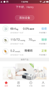 2、用户可以通过鱼跃健康管家连接鱼跃智能血压计和智能血糖仪;