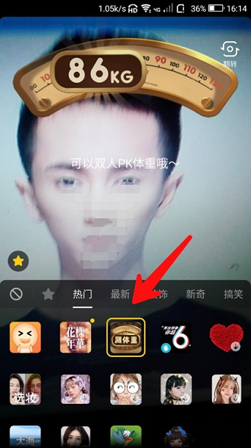 3、在道具选择界面,选择热门分类下的测体重的图标应用该特效。