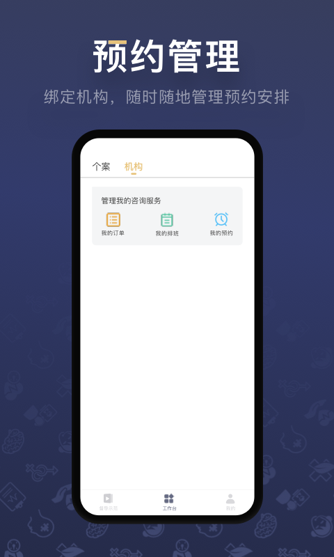 【预约/订单管理】- 邀请码激活,与机构绑定,实时接收机构的预约信息。- 随时随地便捷管理自己的可预约时间。