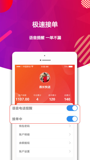 3、拥有更加及时的语音提醒功能,能不遗忘订单,更速度的去接单赚钱,每月多多接单。