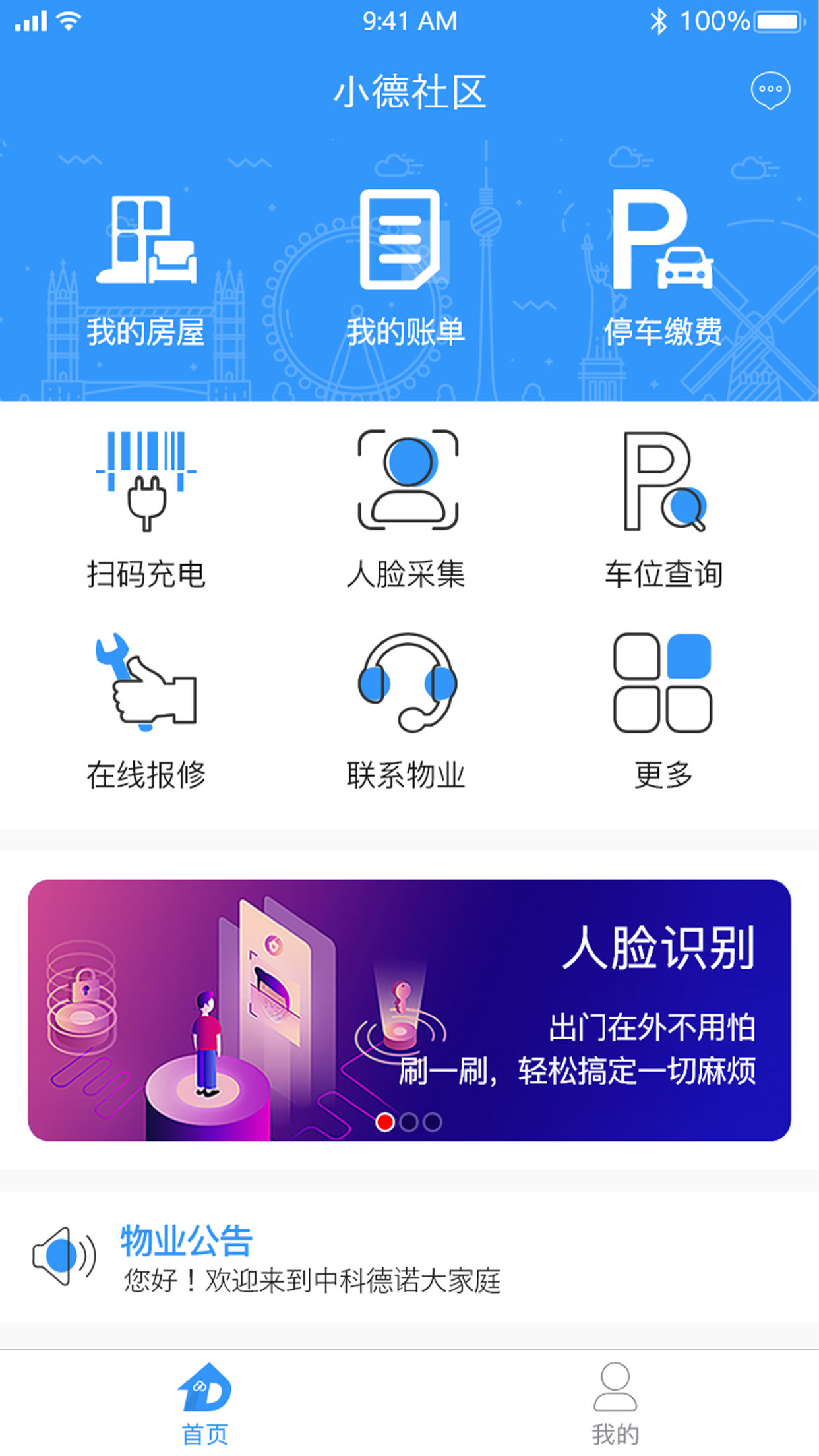 小德社区APP是一款针对城市居民智慧生活的综合性服务平台。以社区为切入点,整合社区内的物业、各种智能硬件服务商等多种资源,为社区居民提供集智慧物业于一体的解决方案。同时围绕目前困扰物业公司的收费难、管理难、维护难等多项问题,提升物业效率,提升居住体验,给物业管理企业和广大业主间建立的一个有效沟通的移动互联网桥梁。