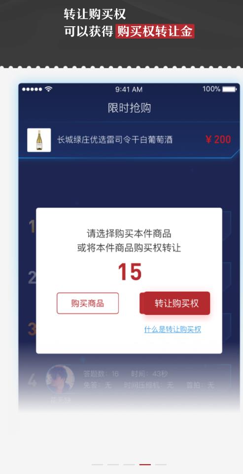 【限时抢购】规定时间内报名参与平台发布的抢购活动,通过趣味答题竞赛获得购买权,获得购买权的用户可选择抢购价购买商品,也可以转让购买权获得收益。
