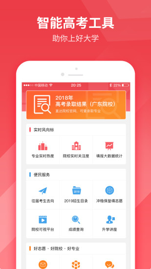 5184高考APP接入广东考试服务网高考成绩网络查询资源,只需登录5184高考APP即可随时随地查询自己的考试成绩。考生们除了从传统途径查询成绩外,还能通过5184高考APP进行实时的成绩查询。目前查询通道覆盖高中学业水平考试、英语听说考试、高考成绩、高考录取结果。