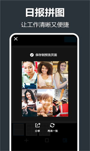 无限添加图片生成日报拼图,让工作更便捷;支持单排、双排、九宫格拼图。