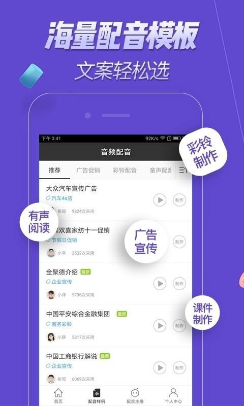3、文案丰富:海量样音模板文案、优质背景音库,完美搭配。