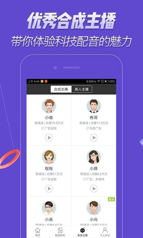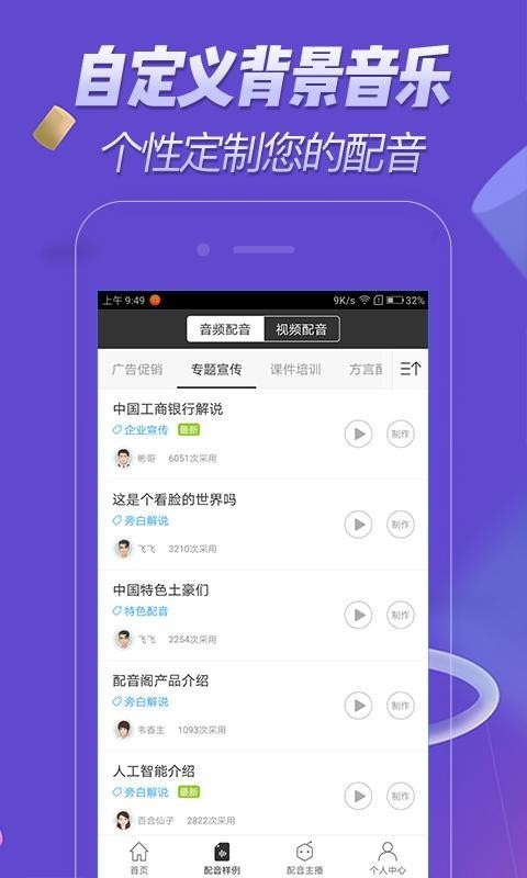 配音软件app是一款文字转的音频制作软件,无论什么样的促销广告、专题广告、方言广告、童声广告、彩铃广告,只需几秒钟即可将文字转换成mp3声音文件。我们有最领先的技术,最优质的配音效果,并且免费提供海量配音模板、各种特色的发音人主播,让您轻松制作好声音。