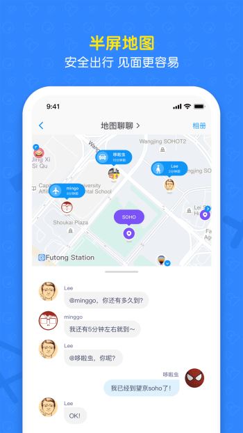 4、半屏地图,上方查看好友位置,下方与好友聊天