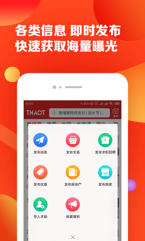 轻松发布交易、房产、招聘求职、优惠、商家信息,迅速获取海量曝光,助力达成交易;分享在柬生活动态,与百万华人交流互动。