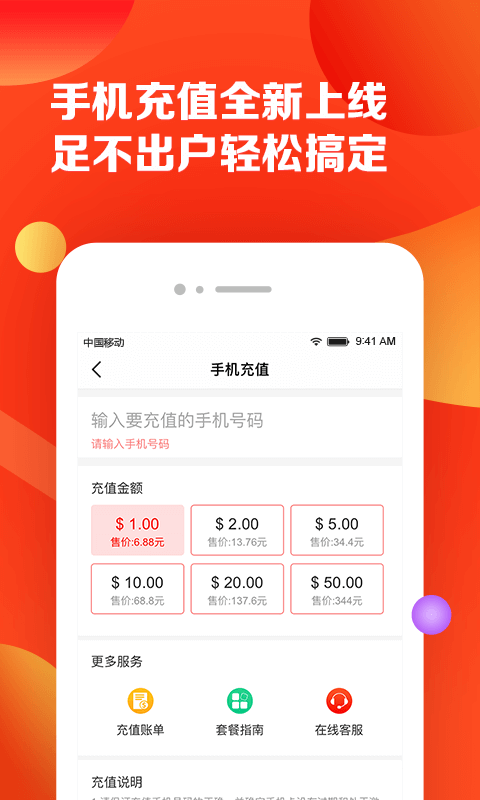 APP内充值话费,多种支付方式,支持本地主流运营商,足不出户更方便!