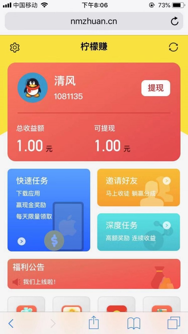 平台特点:新用户注册奖励1元,试玩赚钱任务价格1.1元左右;