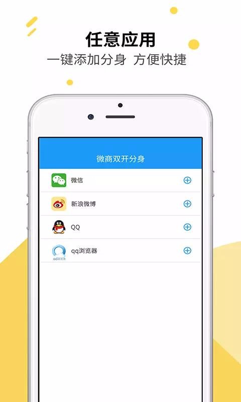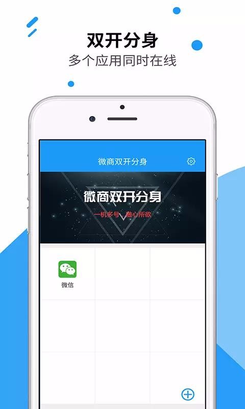 微商双开分身app是一个拥有应用多开功能的工具,您可以通过app自由的添加多开应用,这样就可以确保应用同时在线了,可以满足许多微商用户的使用需求,以后就可以使用app轻松的进行微信多开了,让微商可以在手机上登录多个微信账号,这样才可以及时的回复客户的消息,提升了微商的工作效率,是微商必不可少的多开助手,微商双开分身是一款专为微商朋友们推出的双开软件,这款软件可以更加方便用户们的日常工作,提高工作的效率,微商双开分身让你只用一款手机就能体验到两款手机的工作效率,而且操作简单并且稳定,喜欢微商双开分身的朋友们,欢迎下载使用。