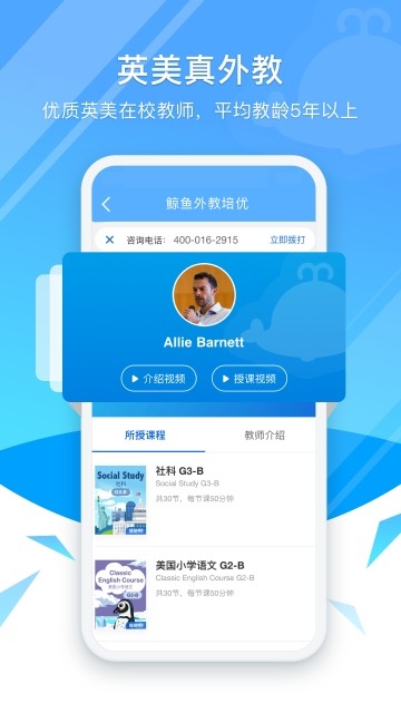 鲸鱼外教培优教师端是一款优质的学习教育平台,提供了英语听说读写培训学习服务,真人外教在线授课教学。同时提供了翻转课堂服务,让孩子们在线学习专业的英语知识。这里有着大量的英语学习资源以及相应的视频讲解,多套教材精准分类,用户随时都能进行线上学习,同时还有专业的外教团队在线授课,智能提醒开课时间,线上传授学习技巧,教你如何学会正确的口语发音,实现更为高效的学习方式,轻松提升英语成绩
