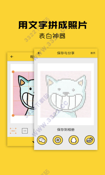 2、支持拍摄、相册裁剪照片,简单设置文字后即可生成照片,一键分享至朋友圈、微博!