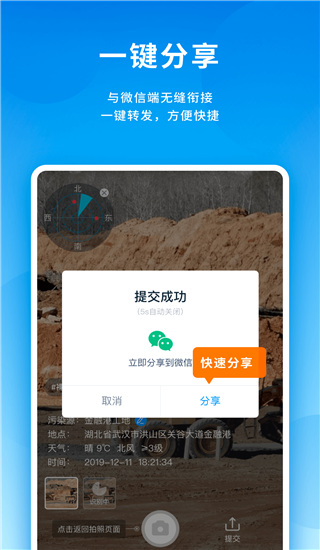 3、一键分享美境相机与微信端无缝衔接,当用户拍照完成后,可将污染事件详情一键转发至微信好友,方便快捷!