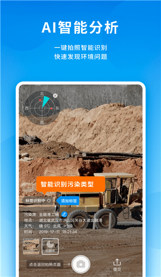 1、AI 智能分析美境相机运用前沿AI智能识别技术,用户只需执行拍照或视频录制简单操作,系统即可智能分析照片中的环境问题,并自动生成拍摄照片以及拍照当时的地理位置、天气、污染源、基本研判分析结果等信息。