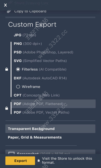 4、强大的导出功能。将高分辨率(300DPI+)的PNG、矢量(SVG)、CAD(DXF)、Adobe Photoshop(PSD)和标准格式的文件发往任何地方。