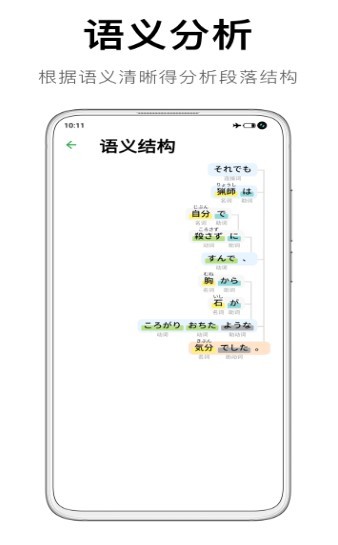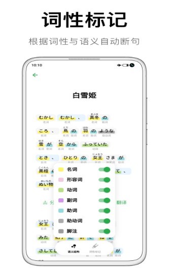 3、词性标记,根据词义与语义自动的断句,帮助学习者了解句意。
