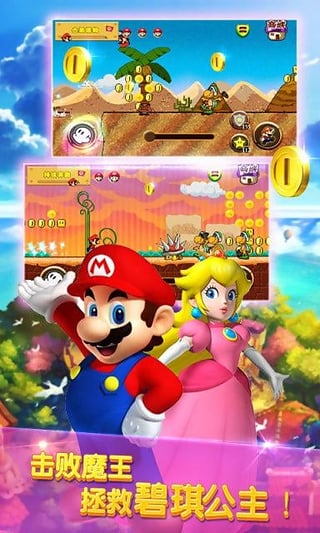 根据儿时经典超级玛丽改编的休闲跑酷类手游,在超级马里奥酷跑安卓版中,玩家可以操作玛丽进行横版的冒险,一路上玩家要消灭各种敌人及boss,才能在最后救出公主,因此本作对游戏的操作要求极高!