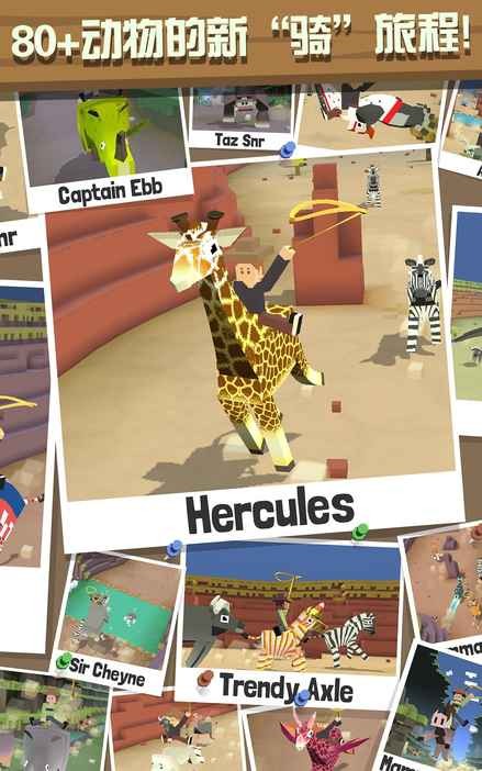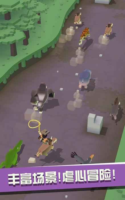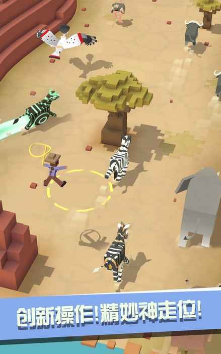 疯狂动物园Rodeo Stampede是一款全新的动作跑酷类手游,游戏融合了模拟养成玩法,这个夏日,让《疯狂动物园》带你引爆跑酷新热潮,一起加入到这场快乐而虐心的“野兽大战”吧!《疯狂动物园》是一款集3D像素、急速跑酷和模拟养成为一体的休闲小游戏。在游戏中你将扮演一名富有冒险精神的绝世牛仔。在高速移动的情况下与各种动物一较高下。你要尽可能多的套住动物,将它们统统带回飞船上的“空中动物园”中饲养;并进行园区升级,以便迎来世界各地的游客观赏赚取更多金币。 Now,让我们去好好大干一场吧!