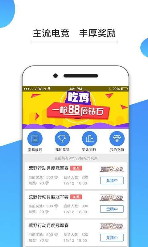 4、每天数千场各类比赛:赏金赛、水友赛、锦标赛、福利赛、明星赛。为喜爱竞技,喜爱游戏的你随时随地与战友一起开团,开启竞技生涯!