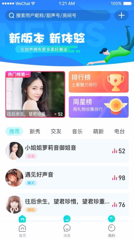 甜声app是一款面向真实用户的交友恋爱平台,在常规的社交基础上加入了许多新元素以及新玩法,比如可以加入语音聊天房间,与其他陌生人互动交友、唱歌、开黑、私信聊天、秀恩爱等都可以,让你可以寻找到有趣的灵魂,寻找到和你一样趣味相投的有缘人;平台中开放了排行榜模块,你可以浏览排行榜,查看最具人气、最热门的用户,排行榜每周更新,如果你也能成功进入排行榜,你就可以获得更多异性青睐以及粉丝了,让你可以尽情秀出自己;app支持私信聊天,可以寻找你的有缘人,与心仪对象一对一互动聊天,可以在这里交到很多朋友,还可以加入大家庭和一群有趣的人交流,能开直播吸引更多的粉丝,把你的魅力散发出来,还有很多好玩的电台充实你的空闲时间。