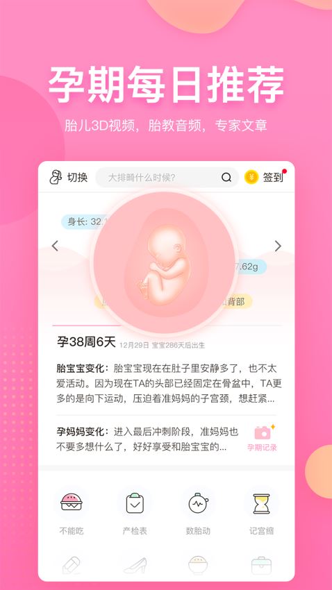 2、能不能吃,能不能做,数胎动,计宫缩,产检解读,孕期食谱、胎教音乐、坐月子食谱,宝宝取名,