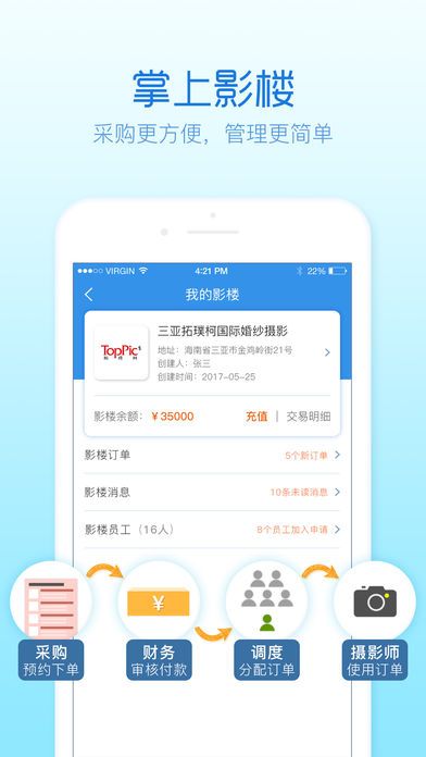 【影楼管理】线上管理影楼,订单从采购到使用,由不同角色的员工负责,优化实体影楼的工作流程,员工各司其职,令影楼订单管理更方便,效率翻倍。