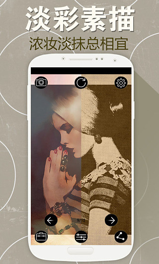 5.操作指南:左右方向按钮可以切换12种不同的风格:铅笔素描、怀旧素描、时光机、铅笔淡彩
