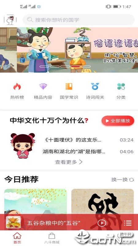 八斗国学app是面向3-14岁的儿童打造的一款国学学习应用,涵盖国学常识、四大名著、蒙学经典等多类音视频课程,让广大学生能够简单学习国学知识,掌握国学基础;如果你的孩子喜欢阅读国学书籍,还能在线上书城中挑选喜欢的书籍,直接下单购买纸质书籍,这样就可以在线下阅读国学书籍了,全面满足不同学生的学习需求,能够个性化阅读学习;通过设置闯关答题版块的方式,帮助小朋友巩固学习的国学知识,很轻松的就能答题闯关,掌握更全面的国学知识;对日后学习语文知识也非常有好处,如果您也喜欢,就下载使用吧。