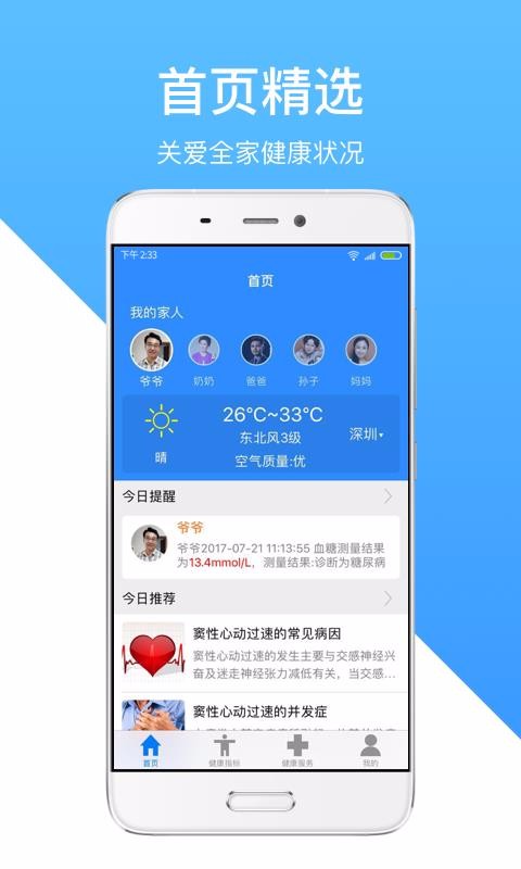 1、今日提醒,各项测量异常结果及时推送给每个家庭成员;