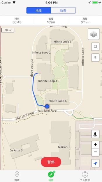 放大或缩小地图,暂停地图服务,查看运动轨迹