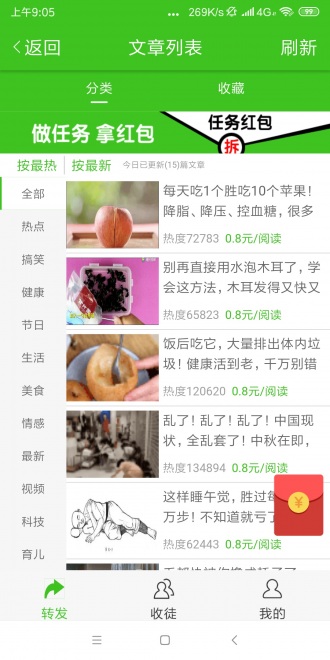 山楂资讯是一款阅读赚钱的软件,这是最新的赚钱软件,它已经升级了操作和退出过程,现在,它是24小时实时滚动更新信息。让用户得到他们想要的商品也很尽职,并且不同商品的单价不同,用户可以自由选择转发。软件使用起来非常的方便,还可以邀请自己的好友来进行赚钱。喜欢的快来下载吧!