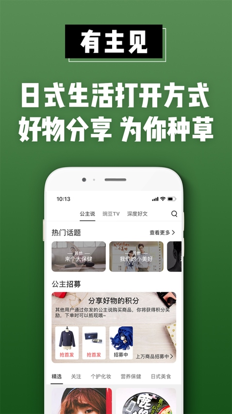 ●100位日本最潮达人帮你选购,还原100%日式风格。豌豆公主邀请100余位日本各领域时尚达人,通过试用,进行产品推荐以及购物指导,分享给您最品质的日式生活。