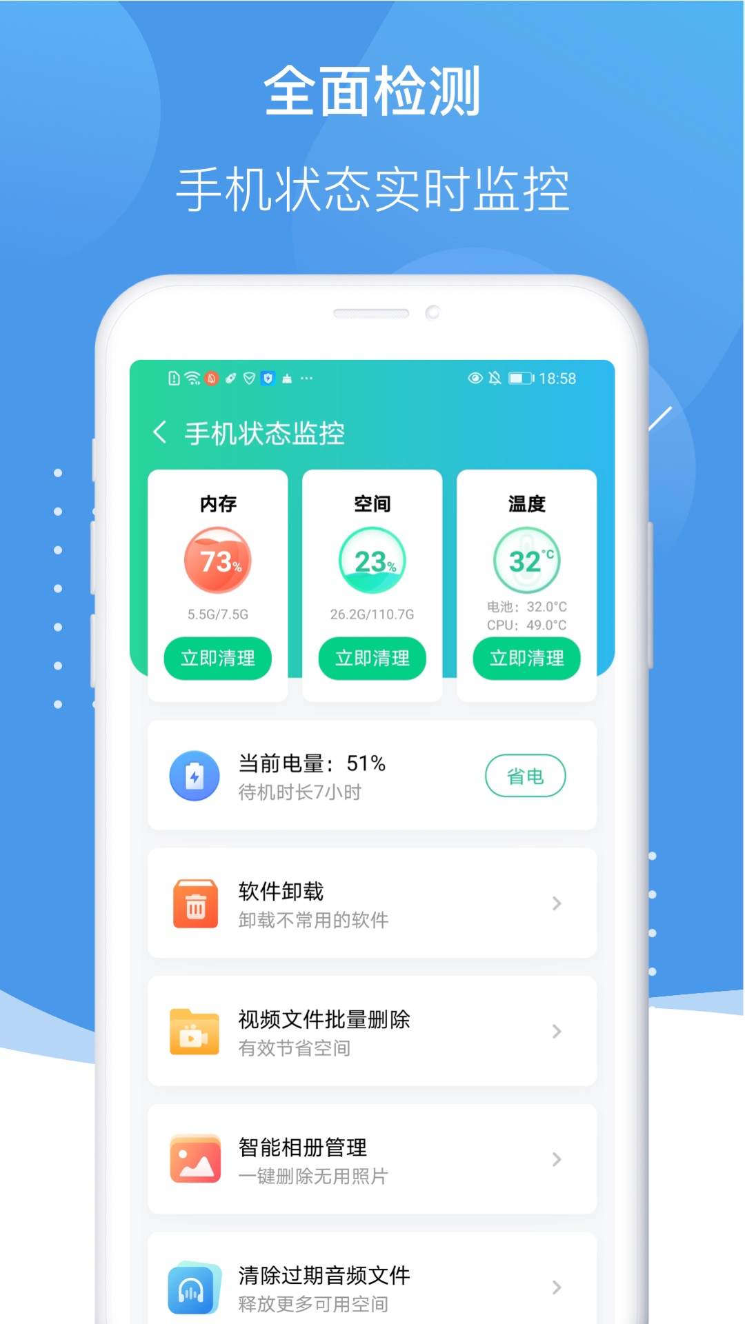 1、全面扫描手机储存空间的各个角落,彻底清除垃圾文件,释放出更多存储空间;