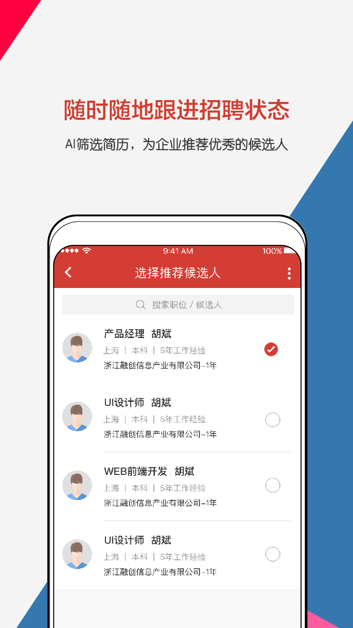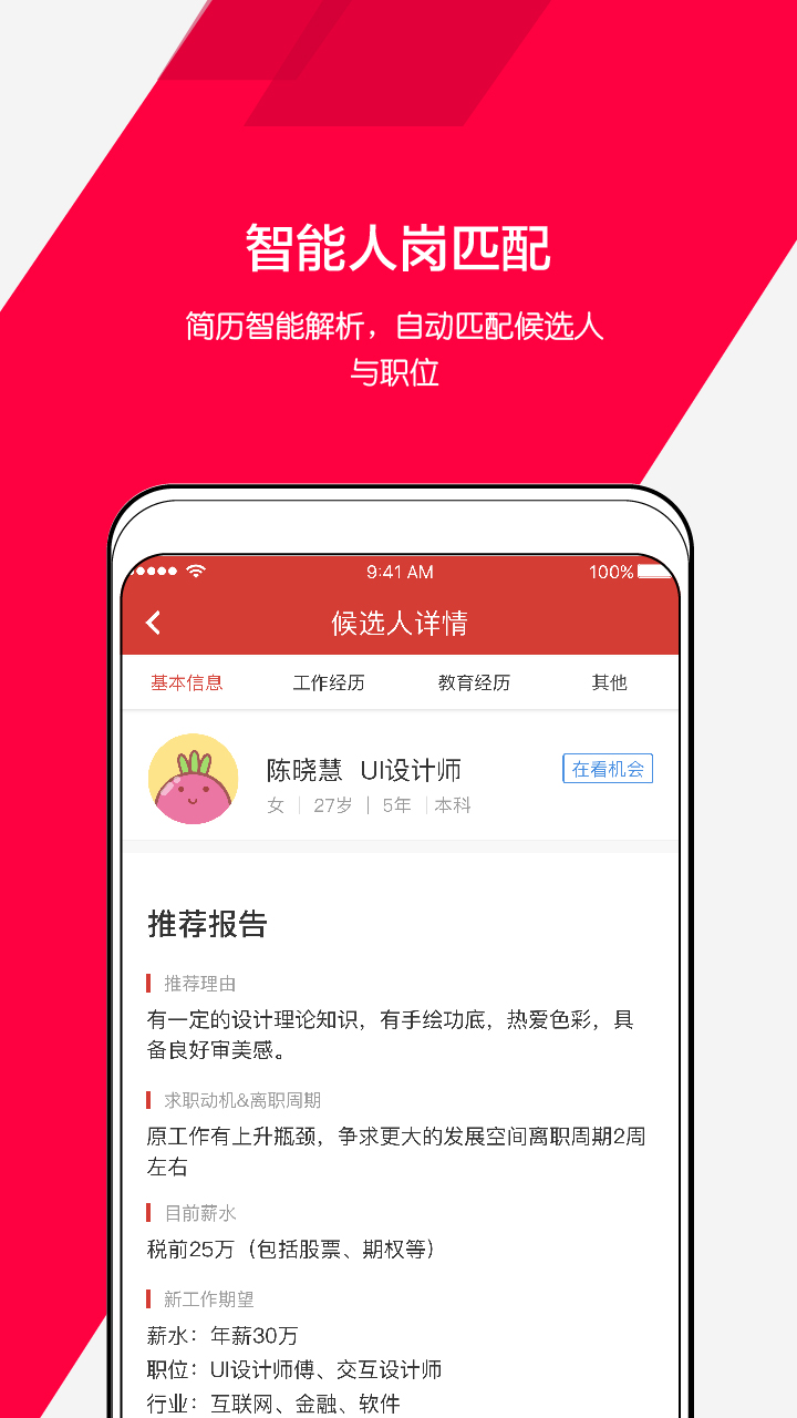 4、智能的人工匹配将直接实现简历的智能解析,为你快速寻找到所需要的人才,更能随时随地了解招聘状态,直接与猎头和职业分析师进行沟通。