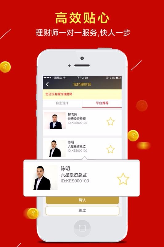 智能匹配优秀理财师,app会自动根据用户的投资需求,推荐优秀的理财师;