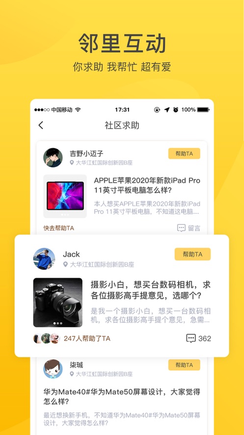 通过邻里互助、文化帖子交流、社区闲置物品交易等业务为社区提供更加全面的服务