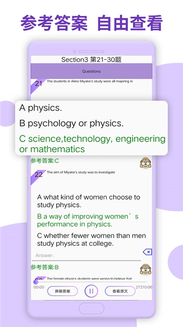 2. 在线练习模式: 在练习模式中,您可以随时查看答案,翻看精准的同步原文和解析。遇到难题?不用担心,反复练习吧;