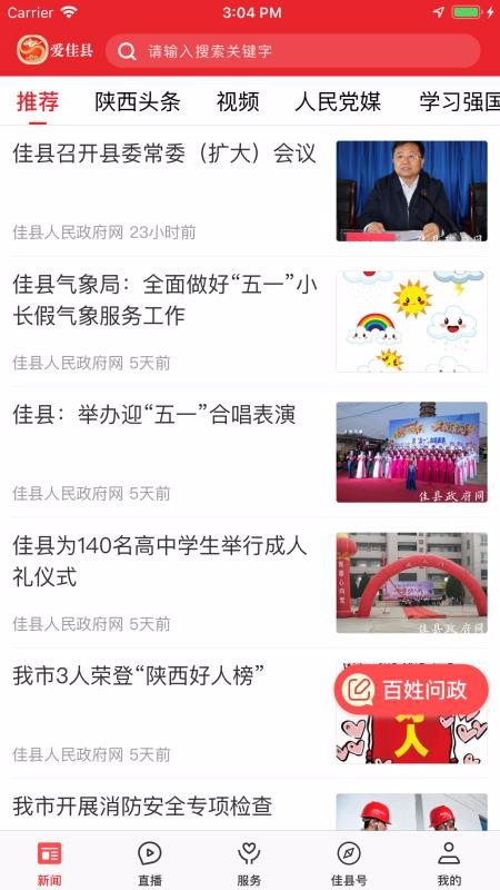 爱佳县app作为佳县融媒体中心主办的“新闻+政务+服务”综合APP,是权威的舆论宣传主阵地。开设了新闻、直播、电视、广播、服务、“爱佳县”等栏目,整合了县域内网站、微信、微博、短视频等自媒体和部门、镇(办)、社区、村组政务服务资源。用户可通过客户端,第一时间了解佳县政治、经济、民生、服务等方面的动态,同时提供各种便民服务,还可参与实时互动,实现“一端在手,尽享智慧”。为用户提供了许多的融合号信息,您可以在线快速的关注融合号,这样就能获取各个融合号提供的新闻内容,满足用阅读新闻的需求;需要的用户快来下载吧!