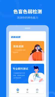 色盲体检宝是一款测试色盲的软件,可以一键色盲测试,色盲体检宝app帮您辨色,从容应对体检。同时也可以作为弱视训练的工具,锻炼辨色能力,在色盲检查中,每个人的情况不同,每张图的情况不同,色盲体检宝可以帮您在体检前,熟悉图谱,提前自检,认识色盲色弱,色盲体检色盲体检宝app可以有效的检测出色盲色弱,色盲体检宝app题型丰富,测试种类多样,还会为你科普和解读色盲相关的小知识。