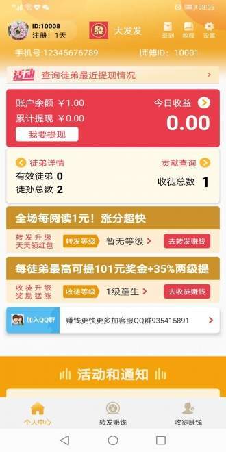 1、新用户下载登录就送1元奖励,转发阅读单价全天1元;