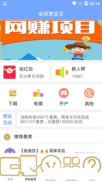全民赏金王app是一款悬赏推广赚赏金的客户端应用,全民赏金王软件方便空闲时间多的用户参与网络做任务活动,在家就能轻松赚,全民赏金王赚钱任务非常多。全民赏金王是一款最新的网赚服务平台,为您汇聚了最全面的网赚信息在咨询,有抢红包的,有阅读新闻的,有电商分享的,有点击广告的等等,简单快捷易操作。全民赏金王APP为您提供全新的赏金体验,感兴趣的朋友欢迎体验