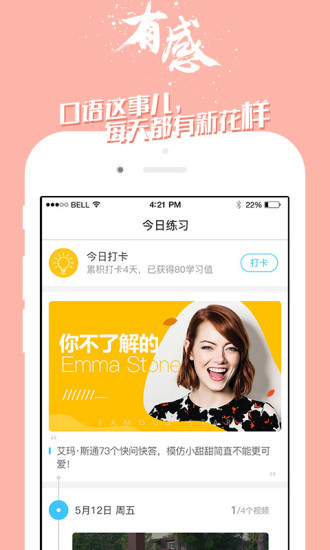 掌中英语软件是一款精心设计的手机学英语利器。简洁的界面、便捷的操作、创新的英语学习理念、高效的学习策略,为广大的英语学习者提供一个最棒的学英语、说英语软件,将英语融入生活,让英语每天都伴随你,对“遗忘英语”、“哑巴英语”说拜拜!本软件通过看短视频的形式,帮助用户尽快的提高英语的口语水平,告别枯燥的学习英语的方式,让用户在掌中看世界的同时,也能轻松学好英语口语。