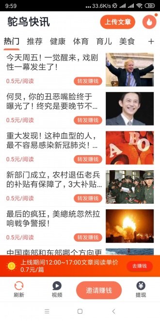 3、邀请好友下载鸵鸟快讯最高可获得39元的奖励,以及两级好友共30%提成奖励